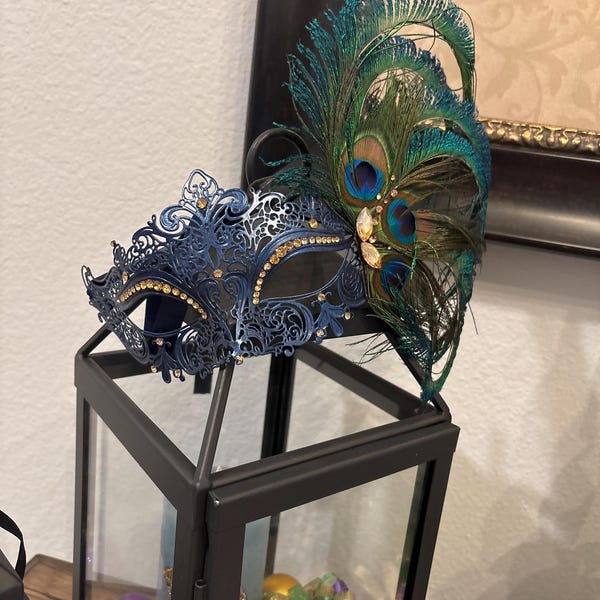 Elegant Venetian Navy Blue Metal Mask with Peacock Feathers- Regular price