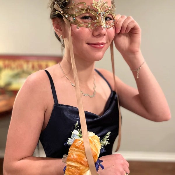 Make a dramatic entrance in an intricately decorated half mask on a wand or feathered mask on a stick. Many feature Baroque-style curls, floral motifs and gemstone accents.