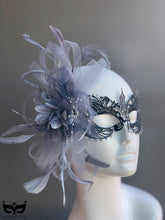 Elegant masquerade mask for women featuring black filigree metalwork, floral accents, pearl sprays, and grey tulle with feathers - ideal for masquerade balls or formal galas.