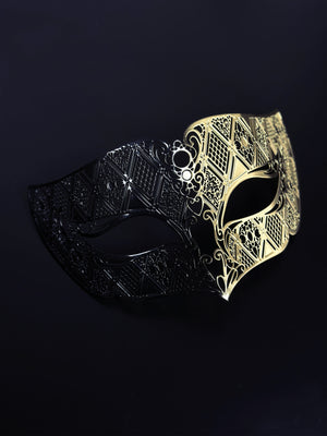 An enchanting lace mask in striking gold and black tones, designed for masquerade balls, weddings, proms, and costume events. The detailed lacework and satin ties provide a secure and elegant fit, making it ideal for all-day or evening wear.
