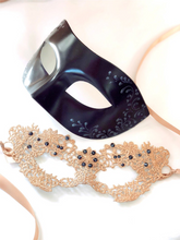 Elevate your evening with this black and gold couples masquerade mask set. The men’s mask is crafted from sleek vegan leather with embossed flourishes, while the women’s lace mask shimmers in gold, adorned with black gemstones. Perfect for masquerade balls, prom nights, Mardi Gras, and Venetian-themed events. A striking duo for unforgettable entrances.