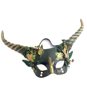 The Inferno Horn masquerade mask in black blue and gold is a bold gothic piece made for masquerade balls, Halloween, and fantasy cosplay. Featuring sculpted horns with a metallic gold twist, this mask pairs seamlessly with gothic outfits, cloaks, or formal black and gold attire.