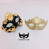 Step into timeless Venetian elegance with the Solar Majesty Couples Masquerade Mask Set. The men’s mask radiates bold baroque energy with golden scrolls and a sun emblem, while the women’s mask dazzles in intricate golden filigree. Perfect for weddings, proms, Venetian masquerades, and Halloween events, this set ensures both partners shine in regal harmony.