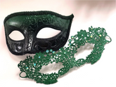Stand out with this black and emerald green masquerade mask set for couples. The men’s mask has elegant scroll detailing. Perfect for Mardi Gras, Venetian balls, weddings, or elegant masquerade parties, this set offers a bold and coordinated look for unforgettable evenings.