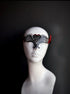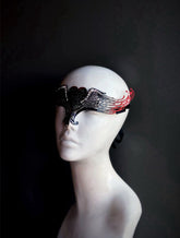 A stunning wing-inspired lace mask in black and red, featuring intricate detailing and rhinestone accents, perfect for elegant events or themed parties.