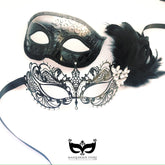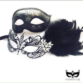 Step into timeless sophistication with this black and silver couples' masquerade mask set. The men’s mask highlights smooth Venetian curves, while the women’s mask shines with silver filigree, rhinestones, and feather accents. Perfect for prom, masquerade balls, weddings, or Venetian-themed events.