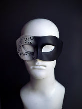 A sleek Venetian-style men's mask in black and silver with elegant floral detailing, perfect for formal events and masquerade balls.