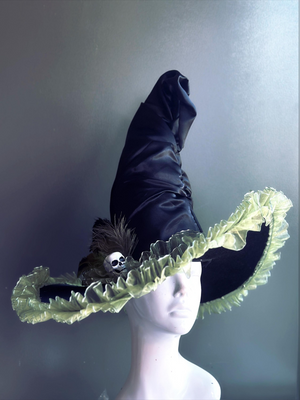 Elevate your Halloween look with this luxurious black velvet like witch hat. Features a tall Cone that’s pointy and can be curled to any length if you prefer tall or short! Ideal for Halloween parties, spooky photo shoots, or witch-themed cosplay.