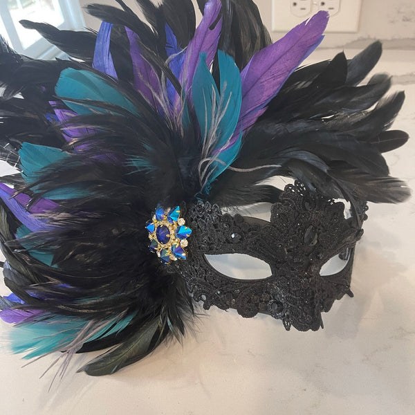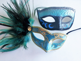 Make a celestial entrance with this blue and teal couples masquerade mask set. The men’s mask features glitter accents with crescent moon motifs, while the women’s mask shines in teal glitter with dramatic feathers and gold trim. Perfect for masquerade balls, Mardi Gras, prom, and themed parties. A striking set for couples who want to shine together.