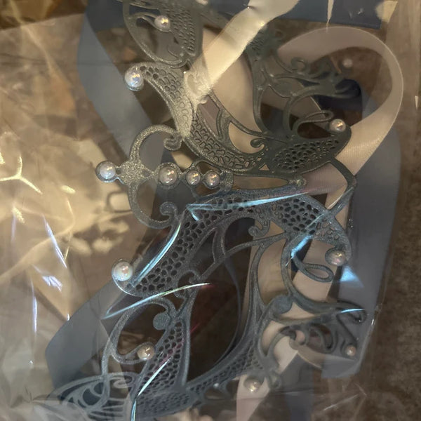An enchanting blush pink masquerade mask crafted with delicate filigree metal, soft feathers, and a floral centerpiece. Its romantic design makes it a stunning choice for proms, masquerade balls, Mardi Gras, or themed celebrations. Lightweight and comfortable, it ensures all-night elegance and charm.