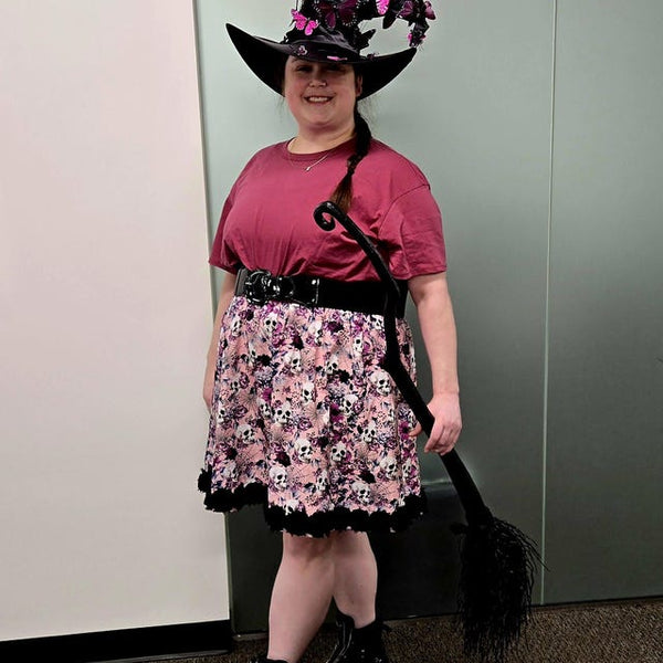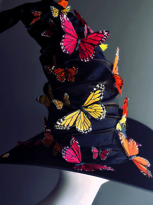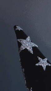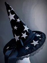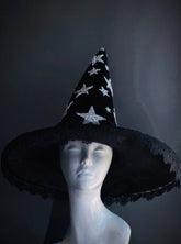 This bewitching black witch hat is adorned with glittering silver stars and delicate lace trim, perfect for those looking to shine with a touch of elegance at their next Halloween event.