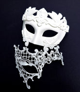 This captivating set includes two stunning white masquerade masks: the women's is a half-face style with rhinestones while the men's is a gladiator style. Together, you'll create a mesmerizing duo that stands out at any masquerade affair or special event!