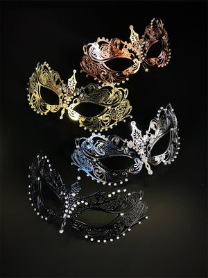 Immerse yourself in the charm of our women's mask – a silver brocade masterpiece adorned with mesmerizing rhinestones. For the men, our black Venetian mask is embellished with silver glitter around the eyes, creating an air of intrigue and sophistication. Perfectly paired for an unforgettable night of sophistication, our masks are crafted with precision and adorned with the finest details to make your entrance truly magical.