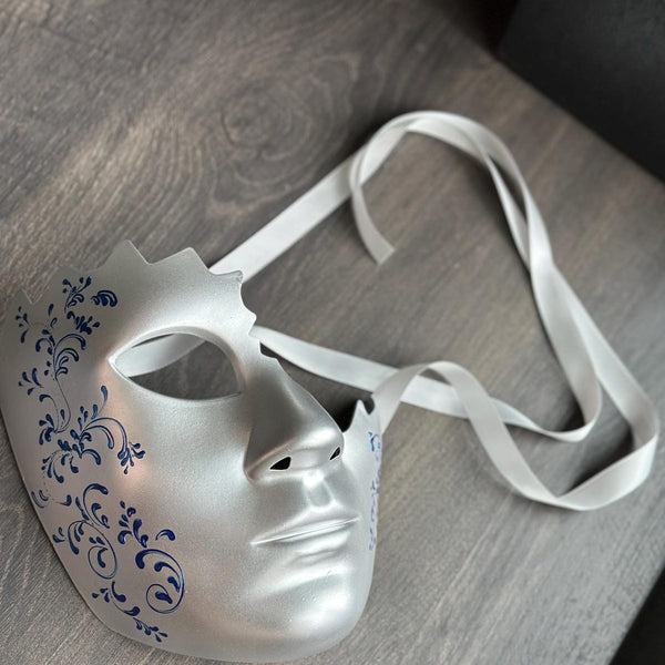 Immerse yourself in the charm of our women's mask – a silver brocade masterpiece adorned with mesmerizing rhinestones. For the men, our black Venetian mask is embellished with silver glitter around the eyes, creating an air of intrigue and sophistication. Perfectly paired for an unforgettable night of sophistication, our masks are crafted with precision and adorned with the finest details to make your entrance truly magical.