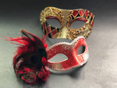 Couple's elegant Venetian masquerade mask set in red and silver/Gold combination. Adorned with peacock feathers, the women's mask exudes a sense of opulence that will leave admirers enchanted.