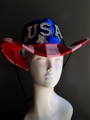 Patriotic USA flag cowboy hat with stars, stripes, and painted horses. Perfect for 4th of July, festivals, concerts, rodeos, and country glam.