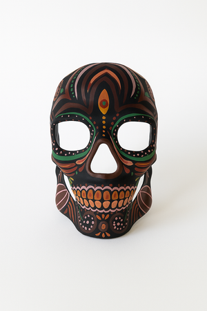 This Dia de los Muertos skull mask features an intricate spiderweb forehead design and a crown of bold flowers in red, black, and blue. A full-face statement piece, it’s perfect for Halloween, parades, and cultural events. Lightweight, comfortable, and designed to stand out.