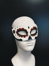 This copper, black, and white Day of the Dead masquerade mask features floral accents and bold sugar skull details. A festive choice for Día de los Muertos or Halloween events, it adds the perfect mix of tradition and flair to your celebration look.