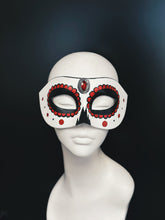 This red Day of the Dead masquerade mask features floral accents, bold sugar skull details, with a ruby gem in the center. A festive choice for Día de los Muertos or Halloween events, it adds the perfect mix of tradition and flair to your celebration look.