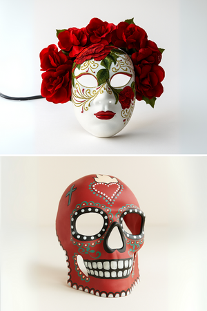 Step into tradition with the Eternal Shadows couples sugar skull mask set. The women’s mask is adorned with a bold blue, black, and red flower crown over a brown skull with intricate web details. The men’s mask features a fierce white skull with spiderweb accents and a bat motif. A perfect pair for Día de los Muertos, masquerades, Halloween, and themed weddings.