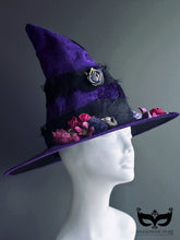 A botanical twist on the classic witch hat—this velvet purple hat is crowned with dried blooms and rustic textures. Perfect for magical garden parties, Halloween, or witchy photoshoots
