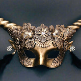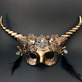 Crafted with exquisite details, the women's gold mask features graceful, long horns that evoke the mystique of mythical creatures. With its intricate design and dramatic, curled goat horns, this gold demon mask embodies a powerful, enigmatic presence. From grand masquerade balls to enchanting soirées, our horned mask set transports you to a world where imagination knows no bounds.