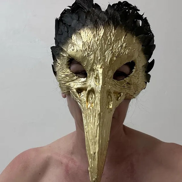 A striking golden bird mask adorned with sculpted feather details and a dramatic long beak. This intricately crafted piece exudes mystery and elegance, making it the perfect choice for masquerade balls, fantasy events, and theatrical performances.