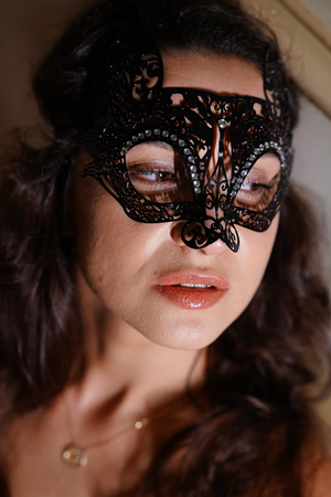 - Mask Color Glossy black base with silver spikes and royal blue rhinestones