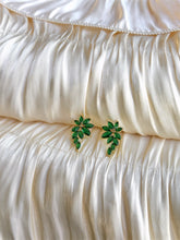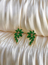 Stunning emerald green earrings with marquise-cut crystals arranged in a nature-inspired floral pattern. Hypoallergenic, non-tarnish, and waterproof.