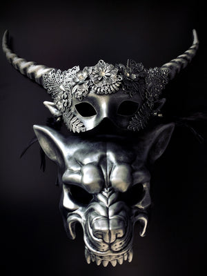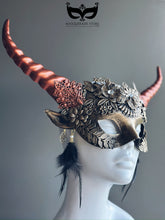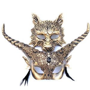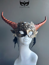 Step into myth and mystery with this horned masquerade mask adorned in metallic floral filigree. Its bronze-toned base and striking copper horns create a dramatic look perfect for fantasy masquerade balls, cosplay, or theatrical events. Lightweight yet commanding, it merges elegance with fierce statement style.