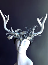 Winter Frost is a silver woodland antler headdress adorned with frosted leaves and icy accents. Designed for masquerades, cosplay, and festivals, it channels forest spirit energy and wintry magic.