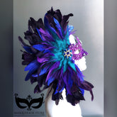 Dramatic and enchanting, this purple and teal feather masquerade mask is adorned with sparkling rhinestones and a jeweled centerpiece. Perfect for Mardi Gras, masquerade balls, and prom nights, it combines lightweight comfort with bold style for an unforgettable look.