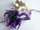 Celebrate Mardi Gras in regal style with this couple's masquerade mask set. The men’s mask features a sleek gold baroque design, while the women’s mask dazzles in rich purple with peacock feathers, glitter swirls, and a gemstone accent. Perfect for parades, carnival balls, and masquerade parties.