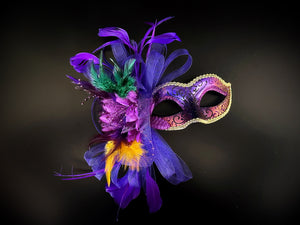 Elegant Mardi Gras mask in gold, green, and purple with intricate swirling patterns and sparkling details for a festive and sophisticated look.