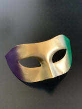Celebrate Mardi Gras with this bold gold, green, and purple masquerade mask in a sleek bauta style. Lightweight and comfortable, this unisex mask is perfect for Carnival parades, masquerade balls, and festive parties.