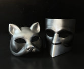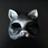 A two-piece masquerade mask set featuring a sculpted cat mask and a modern geometric face mask, crafted from resin and lightweight plastic with a smooth matte finish and subtle metallic sheen for balanced, comfortable wear. Designed for masquerade balls, costume parties, and themed events, the set offers contrasting styles that can be worn individually or shared. Inspired by contemporary explorations of dual identity in modern masquerade aesthetics.