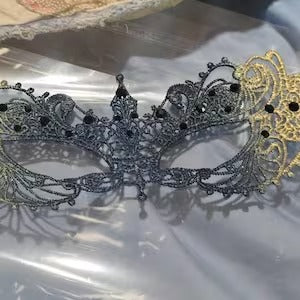 A striking black and gold Venetian mask featuring musical note details, intricate scrollwork, and a polished finish. Perfect for elegant masquerades and performances.