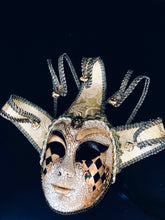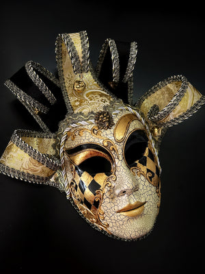 Gold black themed whimsical and colorful men’s Jester mask inspired by the traditional Venetian Carnival. This mask features vibrant colors, intricate designs, and exaggerated features to convey a sense of playfulness and jest.