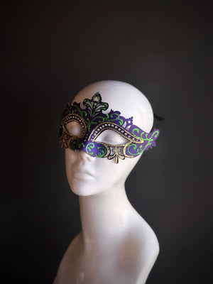 This exquisite mask embodies the festive spirit with its vibrant colors of purple, green, and gold. Whether you're heading to a masquerade ball, a Mardi Gras celebration, or simply looking to add a touch of extravagance to your evening, this mask is your perfect choice.