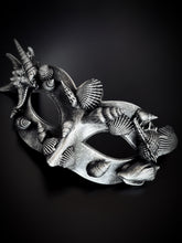 A silver merman masquerade mask featuring shells for dreamy ocean elegance. Perfect for role play events and costume parties!