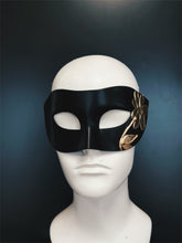 This sleek black masquerade mask features a hand-painted golden floral motif. Its smooth contours and elegant detail make it the perfect choice for men attending masquerade parties, galas, or formal costume events.