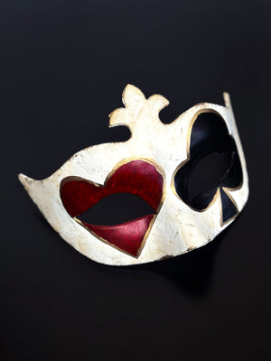 Bring playful chaos to the party with this harlequin jester-inspired mask, adorned with bold hand-painted black diamond and red spade card symbols. A perfect blend of carnival mischief and high-stakes flair, it’s made for casino nights, masquerade balls, and Halloween fun. Jokers wild—let the games begin!