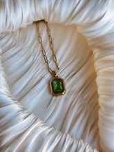 This necklace showcases a striking green crystal gem framed in gold, suspended from a bold link chain for a refined modern look. Designed to be hypoallergenic, non-tarnish, and waterproof, it combines timeless elegance with lasting durability.