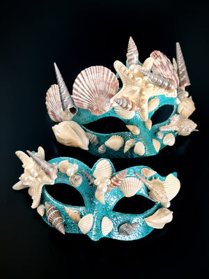 Dive into elegance with this seashell masquerade mask set, designed for couples who love the sea. Featuring sculpted seashells, starfish, and ocean-inspired details in shimmering gold, these masks are perfect for mermaid-themed parties, beach weddings, Mardi Gras, and fantasy events. A striking duo that embodies the magic of the ocean.