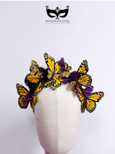 This Orange and Purple butterfly headband features layered monarch-style butterflies arranged in a dramatic crown silhouette. Designed for costume styling, fantasy looks, and themed events, the dimensional wings create bold movement and visual impact. Ideal for masquerade parties, festivals, Halloween costumes, or editorial photoshoots, this statement headband adds an enchanting, whimsical finish without overwhelming the look.