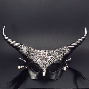 This ram horn skull headdress channels the energy of ancient pagan shamans, featuring intricate hand-finished details, twine-wrapped horns, and ritualistic feather adornments. A striking piece for pagan ceremonies, mystical gatherings, and dark fantasy events.