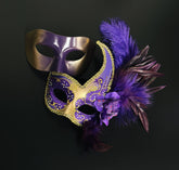 Elegant purple and gold masquerade couples mask set featuring feathers, glitter accents, and classic Venetian styling for balls and parties.