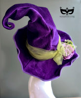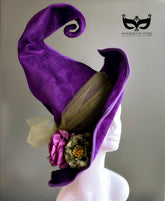 Complete your witchy transformation with this bold purple velvet hat—perfect for Halloween costumes, cosplay, or magical events. Yellow tulle and florals add a touch of enchantment.