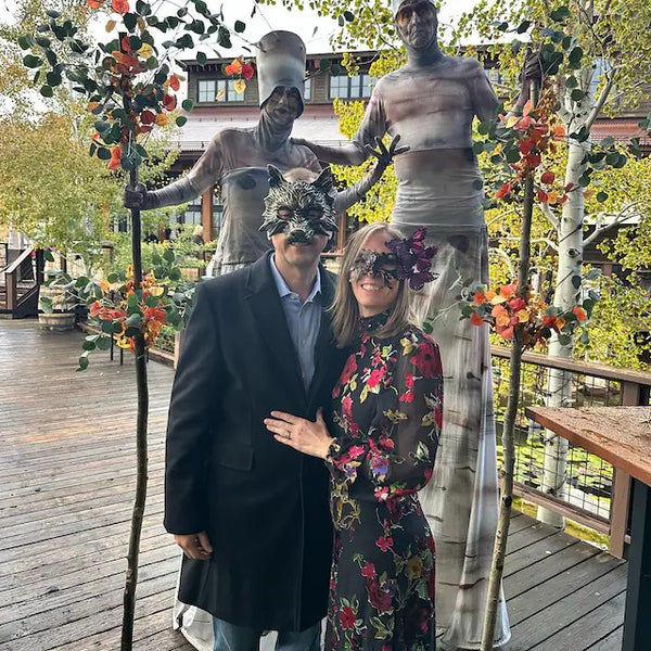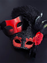 Bold red and black masquerade couples mask set with lace, glitter, and feather accents, designed for Venetian balls, Mardi Gras, and parties.