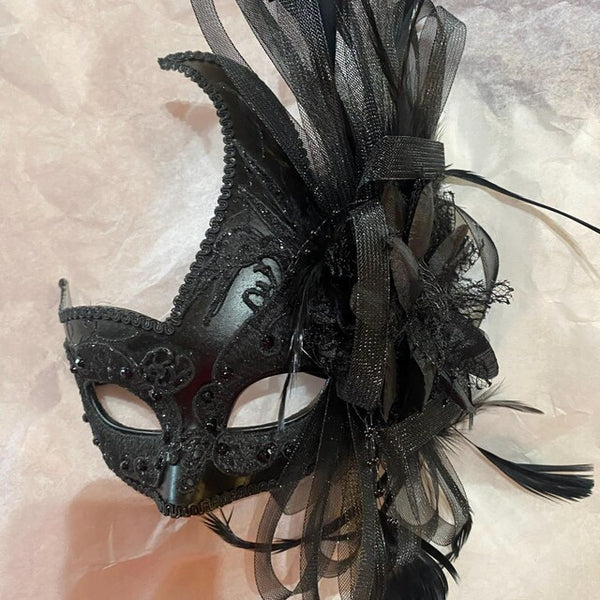 All masks include ribbons or elastic bands, except handheld stick masks.
